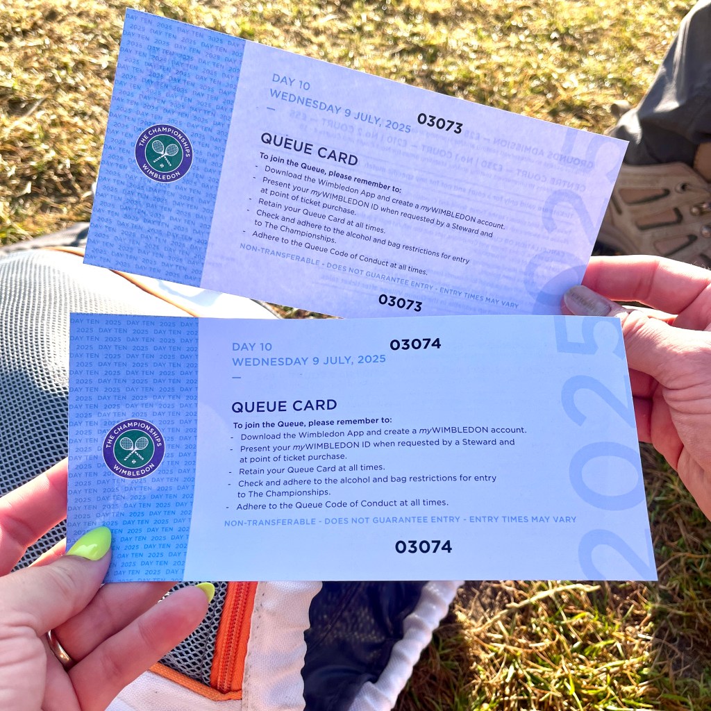 To provide context, we arrived at 7:45 AM on Day 3 and were approximately 8,900 in line. We got the grounds passes and entered the grounds by 1 PM. Fortunately, there was some drizzle and play was delayed, so we got to see a full day of tennis. On Day 4, we arrived at 6:45 AM (an hour earlier!) but were approximately 9,900 in line (we learned about the X account on this day from some lovely Brits). We ended up leaving the queue and walking to the village of Wimbledon for an early lunch and to watch the tennis from the restaurant.