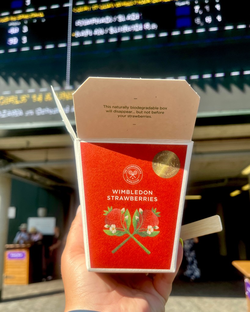 A trip to Wimbledon is incomplete without the iconic Pimm’s Cup and strawberries and cream, so the queues for these can be long. Your best bet for a Pimm’s Cup is to find one of the bars not labeled as “Pimm’s Cup”. They still have it on tap, and I was able to walk right up. Similarly, the strawberries and cream are stocked in the markets, so grab one there instead of waiting in line at the concession specifically marked “Strawberries and Cream.”